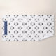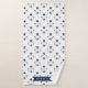 Towel set with three towels: a washcloth with navy blue stripes and an illustration of a polar bear with a paw print; a striped hand towel with the same look; and a bath towel featuring a pattern of polar bears in black, white, and grey. Personalize with your child's name on each towel.