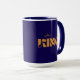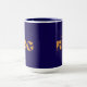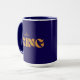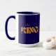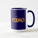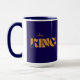 A royal blue coffee mug featuring the word "King" on both sides, written in gold. This mug is a great gift option for any occasion, including birthdays, Father's Day, and Teacher Appreciation Day. It can also be a nice treat for yourself.