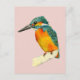 This is a watercolor painting of a kingfisher bird. It is sitting on the edge of a branch. The bird has bright colours. Orange and yellow on his belly and green on his head and wings. He is looking sideways.