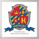 Knights style shield monogram K art name poster perfect for a boys bedroom or playroom in shades of red, yellow, blue and gray. Personalize with your child's own name and name meaning for a truly personalized touch to your child's bedroom or nursery, this example is for the name Kingsley A royal clearing. Regal, adventurous and proud Poster print ideal for a gift to a new baby boy, for a christening, baby naming or baby shower gift. Unique drawing and graphic art and design by Sarah Trett.