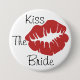 Text reads: "Kiss The Bride". Red lipstick kiss on the centre of this button. Ideal accessory to wear on girl's night out. Enjoy that bachelorette party in style!