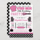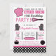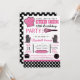 Modern kitchen cooking themed birthday party invitations feature typography, kitchen accessories and utensils, and polka dot patterns in a black, pink, and white colour scheme.