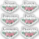 Beautiful floral labels for you kitchen jars and containers to organize your pantry and cupboards with pink roses and a vintage font. The contour stickers read sugar, flour, popcorn, pasta, cookies, and peanuts, but the text is customizable so you can change it to suit your pantry.