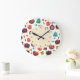 Very cute retro style home cooking pots and pans, pitcher, coffee pot, fruit bowl and utensils on a kitchen clock with dull pink scalloped lace with hour notches in brown.