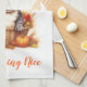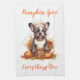 This kitchen towel is shown with a cute French bulldog art print for autumn, text reads Pumpkin Spice Everything Nice.
