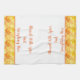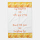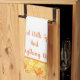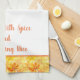 This kitchen towel is shown in fall colour mix of orange and yellows with orange accent stripes. Words of "Blessed with spice and everything nice". Shown on a white towel.