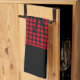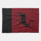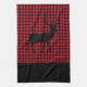 This kitchen towel is shown in a cute black and red buffalo plaid print design with a deer print.