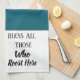 "Bless all those who roost here" is the caption on this Teal Blue and White kitchen towel featuring a White and Red chicken head. Customize this item or buy as shown.
