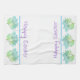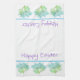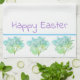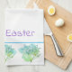 Holiday kitchen towel shown in white with a fresh breath of spring in the kitchen with a blue and green Easter Lily pattern at the edges of the towel with sky blue stripes and Happy Easter in lavender-purple.