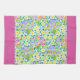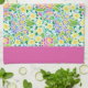 A very pretty Kitchen Towel or Tea Towel, with a pattern of pink, yellow and blue primroses, from a handpainted watercolour design by Judy Adamson. This towel's border is in Pretty Pink but other colours are available.