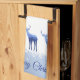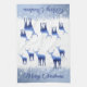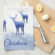 This kitchen towel is shown in wintery blue and white colours with a blue/white snowflakes scene. Several deer in blue tones with wintery scenes shadowing on their bodies grace both ends of this towel. Text of Merry Christmas in deep Sapphire blue over white background.