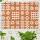 A chic Tea Towel or Kitchen Towel, with a pattern of traditional Welsh Tapestry motifs in White on a Brick Red background.