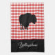 This kitchen towel is shown in a cute red plaid print design with a Yellowstone Buffalo print.
