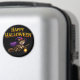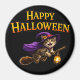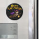 Of enchantment to your kitchen locker or office with this magical tabby witch kitten round fridge magnet this delightful accessory features and adorable tabby kitten and a purple witches hat and cape soaring through the night on her broomstick with a glowing lantern set against a deep black background with a bold golden happy Halloween greeting this high-quality magnet is the perfect way to display your holiday spirit