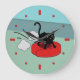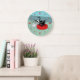 This cute clock has a cartoon of a kitten riding a robot vacuum.