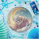 A fluffy white kitten sleeps peacefully cradled by the crescent moon, wrapped in a soft pink blanket
