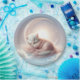 A fluffy white kitten sleeps peacefully cradled by the crescent moon, wrapped in a soft pink blanket