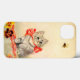 iPhone Case featuring Meta Plückebaum’s artwork Kitten with a Red Ribbon (b. 1876). A grey kitten with dark stripes is beautifully adorned with a red ribbon. The kitten plays with a bee. Yellow flowers decorate the foreground. A wonderful gift for cat lovers and German art enthusiasts!