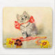 Mouse Pad featuring Meta Plückebaum’s artwork Kitten with a Red Ribbon (b. 1876). A grey kitten with dark stripes is beautifully adorned with a red ribbon. The kitten plays with a bee. Yellow flowers decorate the foreground. A wonderful gift for cat lovers and German art enthusiasts!