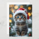 This lovely design features a cute kitten with bright blue eyes wearing a red Christmas hat and surrounded by warm highlights. The blurred background of lights and winter details create a particularly cozy and warm Christmas atmosphere.