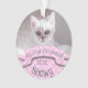 Celebrate your kitten's first Christmas with this personalized ornament. With a background of pink paw prints and "my first Christmas" on a banner, just add your cat's name and the year along with two photographs or your cute little feline!