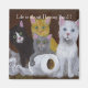 An acrylic painting of four kittens in the moment they are busted while having a wild time with a roll of toilet paper!