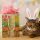 This gift bag showcases two tabby kittens, Easter eggs, and clay pots adorned with tulip and daffodil flowers. The illustrated watercolor design is presented on a parchment background. Ideal for holiday gifting, this charming bag is sure to delight any cat lover. For coordinating tissue paper, please visit my tissue paper collection.