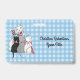 This name or identification badge is blue and white plaid with three cute kittens wearing pink bows sitting with their smiling white mother cat. Customize your name and information with the templates.