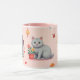 A coffee mug design with a light beige background with three cats. A mug for cat lovers.
