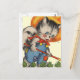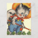 Cute vintage artwork of a striped cat wearing overalls and a straw hat. He's using a hoe in his garden