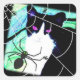 This sticker features a black-and-white cat with glowing pink eyes crouches behind a large black spider on a vivid, eerie cobweb background, blending mystery and Halloween vibes. Finished as a mixed media art print.