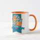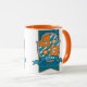 Flynn name meaning shield red blue boys mug. Galiant royal crown knights style crest shield monogram letter F art name mug perfect for kids and teens in shades of orange, teal blue, and grey. Personalize with your own name beginning with F and name meaning or a message or subject for a personalized touch. Reads Flynn Son of red. Brave, charming and strong. Other names available on mugs and other matching products. Unique royal style crest drawing, featuring a lions head, crown, star and initial F monogram letter, graphic art and design by Sarah Trett www.sarahtrett.com for www.mylittleeden.com