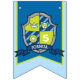 Knights medieval shield themed blue and green Happy birthday 5th flag party bunting. Personalize with your child's birthday year. Currently reads Happy 5th Birthday. Matches other items in the Knights medieval shield collection. Features a regal shield in blue, green and grey design with a bears head and crown. Other matching items available. All original art and design by Sarah Trett. www.sarahtrett.com for www.mylittleeden.com