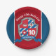 Boys knights medieval shield birthday party disposable party paper plates. Personalize with your own birthday boys name and age. Currently reads Happy 10th Birthday Benjamin. Ideal for childrens knight and maidens birthday parties. Matches other items in the knight shield medieval party blue, red and grey range. Original art and design by Sarah Trett. www.sarahtrett.com for www.mylittleeden.com