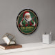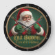 This is a playful, circular-framed graphic design with a Christmas and crafting theme. The central image features a portrait of Santa Claus wearing a green-gloved hand-knit sweater and his traditional red hat. He is holding two red knitting needles with tangled skeins of red and green yarn. The phrase "Knit Happens..." is written in a large, bold, golden font above him, and "Even at Christmas" is written below in a smaller font. The background is a deep green colour, and the entire scene is enclosed in a golden circular frame.