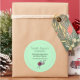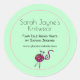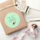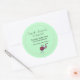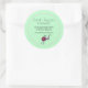 Ball of yarn, knitting stickers with business name, and two more lines for personalization. Include a website, thank you, or address as needed. A ball of yarn with knitting needles is the graphic beneath the text area. Stickers are pale mint green with a light pink circular line border. Larger round sticker is shown (3 inch size), and be aware that the small size is only 1.5 inches and probably too small to use with small text. This design also works on the square sticker. Use on purchases, gift bags, or as envelope seals.