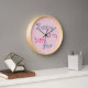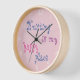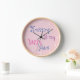 A very pale pink clock with curly wurly, yarn inspired text saying Knitting is my happy place. The clock has white numbers.