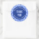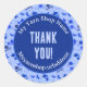 Little round thank you stickers for small business owners. Include your shop name and URL, or social media / e-mail in curved text. Sticker is in shades of blue with “thank you” in the centre. The border design is a knitting theme of cats pulling balls of yarn, knitting needles and little projects being knit. Stickers come in two sizes. The design will work best on round or square stickers.