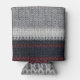 Black and grey knit wool, with red and white stripes, offers cozy texture.