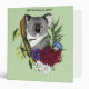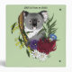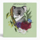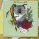 A cute koala bear on a tree limb with flowers and eucalyptus leaves in backdrop of green