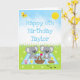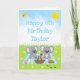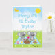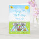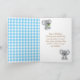 This cute and whimsical birthday card can be personalized with a name or title, such as son, grandson, nephew, friend etc. It features adorable koala bears having a picnic on a blue gingham cloth with treats such as honey, watermelon, strawberry jam, lemonade and pie. In the background is a bright blue sky and sunshine, butterflies and daisies. The text combines decorative and serif fonts for a stylish and modern look. This is perfect for a spring or summer birthday party.