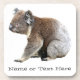 This cute and cuddly koala photo is an Australian or Aussie icon. It's actually a marsupial rather than a bear, and it lives in Australia mostly in eucalyptus trees. This design shows a cutout (no background) photograph of the critter, and shows its dense tan and grey coat, distinctive and unique nose, beady eyes, long claws, and white tufts of ear fur.