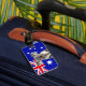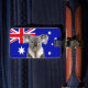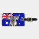 This furry koala is a native of Australia. The Australian flag is in the background. They are easily recognizable by their stout, tailless body and large head with round, fluffy ears and large, spoon-shaped nose.