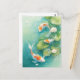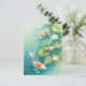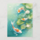 This serene and artistic design features three graceful orange and white koi fish shown swimming through a tranquil, sun-drenched water garden. The koi fish are captured in a gentle, swirling motion, their vibrant orange patterns and long, flowing white fins standing out beautifully against the clear, light turquoise depths of the pond. Surrounding the fish are large, round green lily pads and delicate white lotus blossoms that float elegantly on the water's surface. Shimmering bubbles and soft white petals drift through the water, creating a peaceful and refreshing atmosphere. The overall aesthetic is clean, bright, and filled with natural harmony, making it an exceptional choice for nature lovers and fans of Zen-inspired aquatic art. This peaceful koi fish postcard is an ideal choice for sending a soothing "thinking of you" message or a quiet note of gratitude to a friend who appreciates the balance and beauty of a water garden. You might choose to use this artistic card for a botanical-themed event invitation or as a lovely way to share a message of peace and prosperity with your family during a housewarming. It also makes a beautiful piece of mini-art for a workspace or a calming addition to a creative journal as a small token of aquatic elegance. This versatile design is also an excellent choice for a retirement message, a graduation thank you note, or as a heartwarming way to share a message of joy for any situation or event.