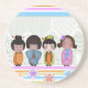 4 cute kokeshi dolls on classic Japanese background pattern.