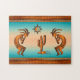 Enjoy this Unique Southwest Kokopelli Puzzle! It Features Two Copper Southwest Kokopelli Playing the Flute and Dancing Around a Cactus Under the Sun on a Turquoise and Orange Sunset Background...Surrounded by a Copper Border!