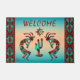Personalize this Unique "One of a Kind" Southwest Kokopelli Doormat! It Features a Two Kokopelli Playing the Flute and Dancing Around a Cactus Under the Sun on a Turquoise and Orange Sunset Background...Surrounded by a Southwest Border in Turquoise, Orange and Black!