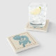 This is a stone coaster with original photo artwork of a kokopelli in turquoise with a rust outline.