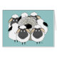 Greeting card showing an adorable, shaggy Komondor dog blending in with his flock of sheep. Caption on the greeting card reads, "Missing Ewe!". Background is displayed as a teal colour, but it and the font and phrase can easily be customized to whatever you'd like.