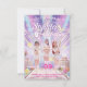 Invitation is changeable This is an image of a vertical party invitation with a vibrant, neon-lit, K-Pop/pop-star theme. Background/Setting: The scene is set on a stage or in a party venue, brightly lit with purple, pink, and turquoise neon lights creating a dazzling effect. A large, glowing star outline in purple neon dominates the center. There are stage lights, spotlights, and confetti streamers filling the air. Characters: Three young female animated characters, stylized similarly to K-Pop idols or futuristic pop stars, stand in the center. They are wearing white, shiny, short outfits with gold accents. The character on the left is holding a gift box. The character in the middle is holding a birthday cake. The character on the right is holding a confetti cannon/party popper. Foreground/Details: The floor is reflective, and the foreground features colorful balloons (pink, yellow, blue) and a path illuminated by vertical pink neon strips leading up to the stage. Text/Information: All text has been removed from the current version of the image, which originally contained birthday party details (Name, date, time, location, etc.).